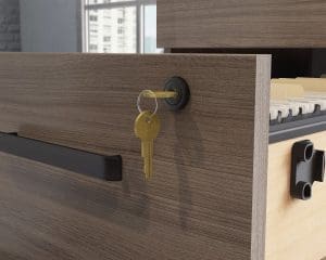• Two drawers with full extension slides hold letter, legal or European size hanging files