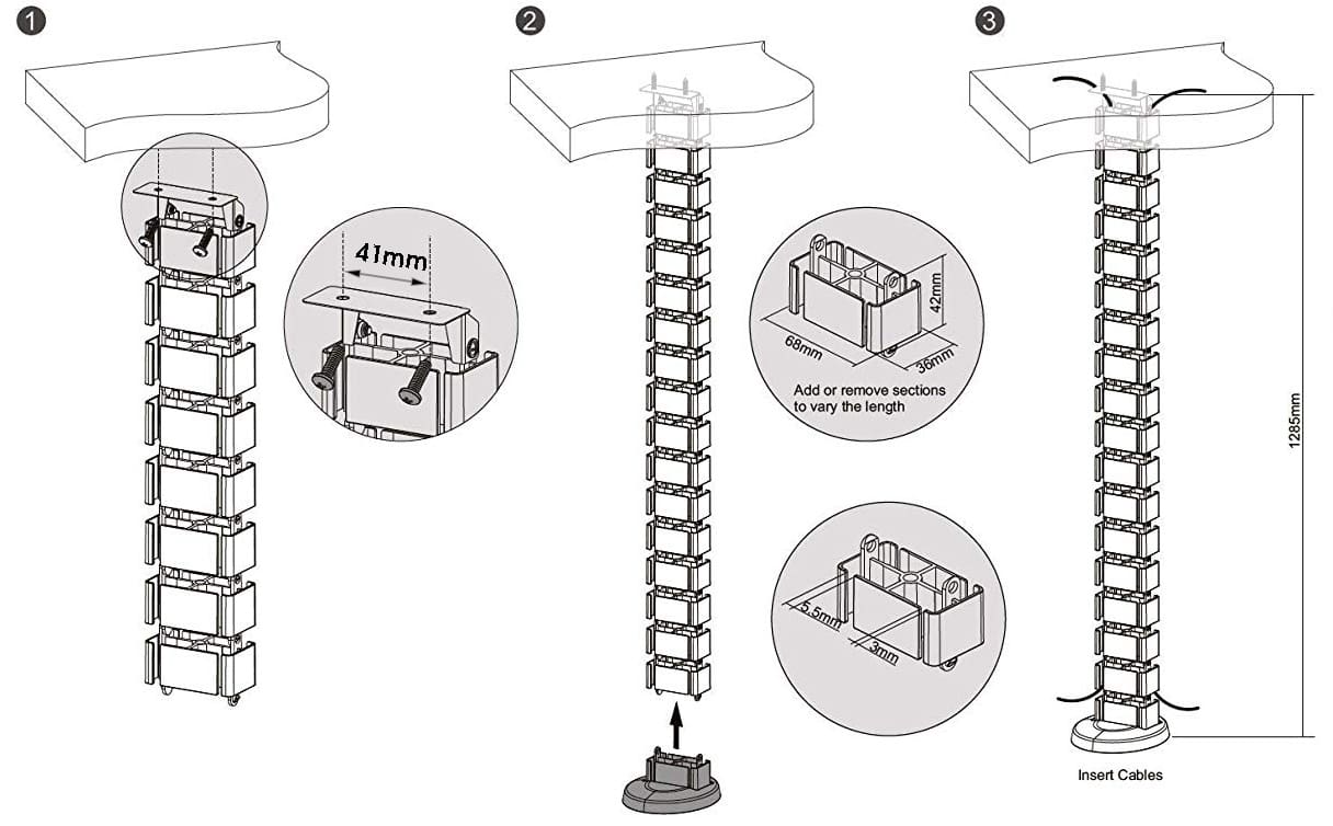 - The total height of the cable spine is 130cm (51.20″) and normally is mounted from the under-desk to the floor. The base is metal for added weight and stability while the spine itself is strong ABS.