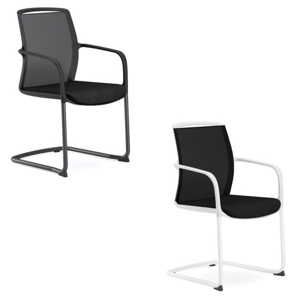 A modern and durable visitor chair with breathable, curved black mesh back that moulds to the user for increased ventilation. Finished with a sturdy cantilever base with anti-tilt feet.