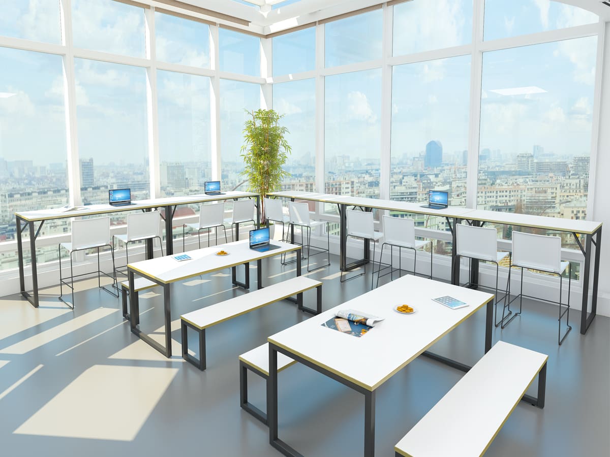 Escape tables are at home in any modern working area. With casual working and office touchdown areas becoming ever popular, Escape tables have been designed with this in mind. Available as desk high or poseur height with panel ends or a hoop leg design finished in Black, White or Silver. Bench seats with optional seat pads are also available in various fabrics and colours.