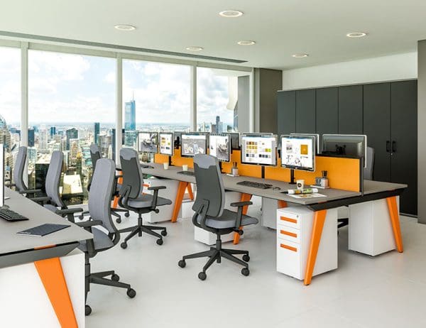 Evolution Bench is the next step in bench desking. Offering all the functionality of a traditional bench system with the added choice of Oak or painted RAL finish legs. Fixed and sliding desktops, a complete cable management solution and a selection of 5 desktop shapes provide the functionality whilst the Oak or selection of 21 RAL colours offer the flexibility to complement any colour scheme. Executive Desks and Boardroom Tables complete this exciting new range.