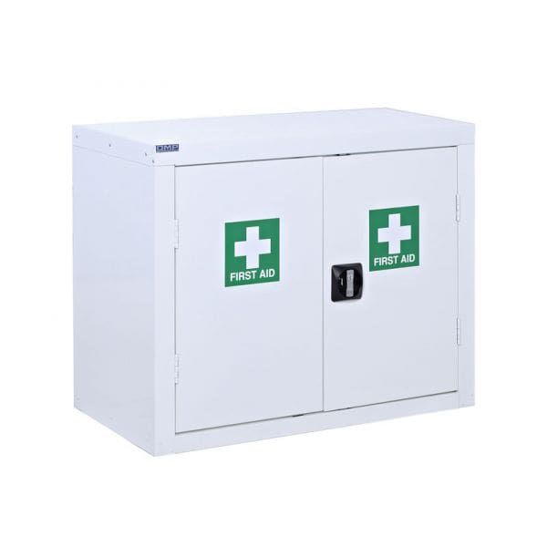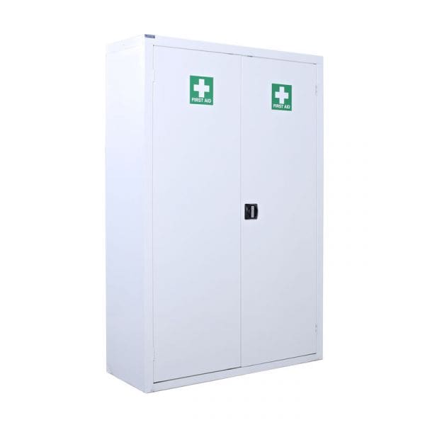 Our robust First Aid Storage Cupboards are manufactured from high-quality steel with instantly recognisable identification symbols and are powder-coated with a fresh white finish with anti-bacterial paint. This first aid storage solution is designed to suit the user’s requirements within the workplace and ensure employers meet their first aid obligations. Available in a variation of sizes, floor standing, wall mounting and mobile.