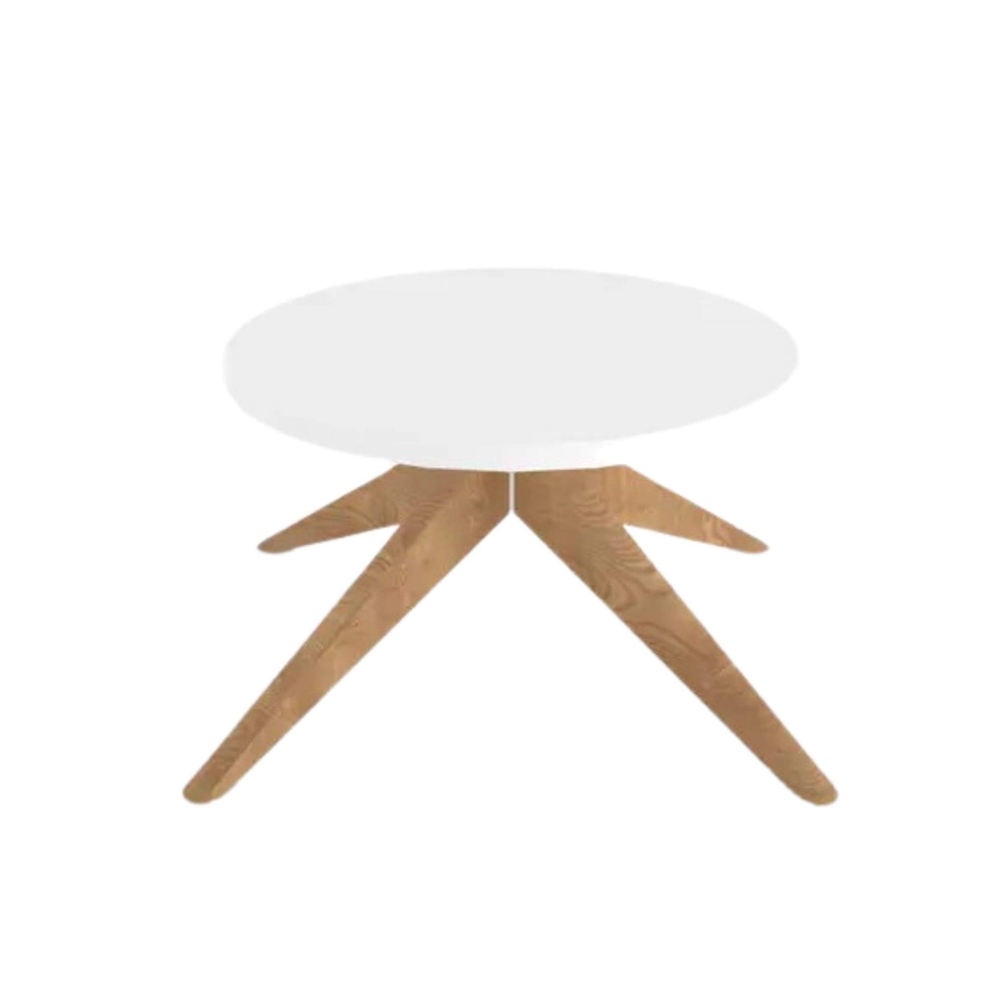 600 DIAMETER WHITE ROUND TOP TABLE WITH OAK WOOD PYRAMID BASE