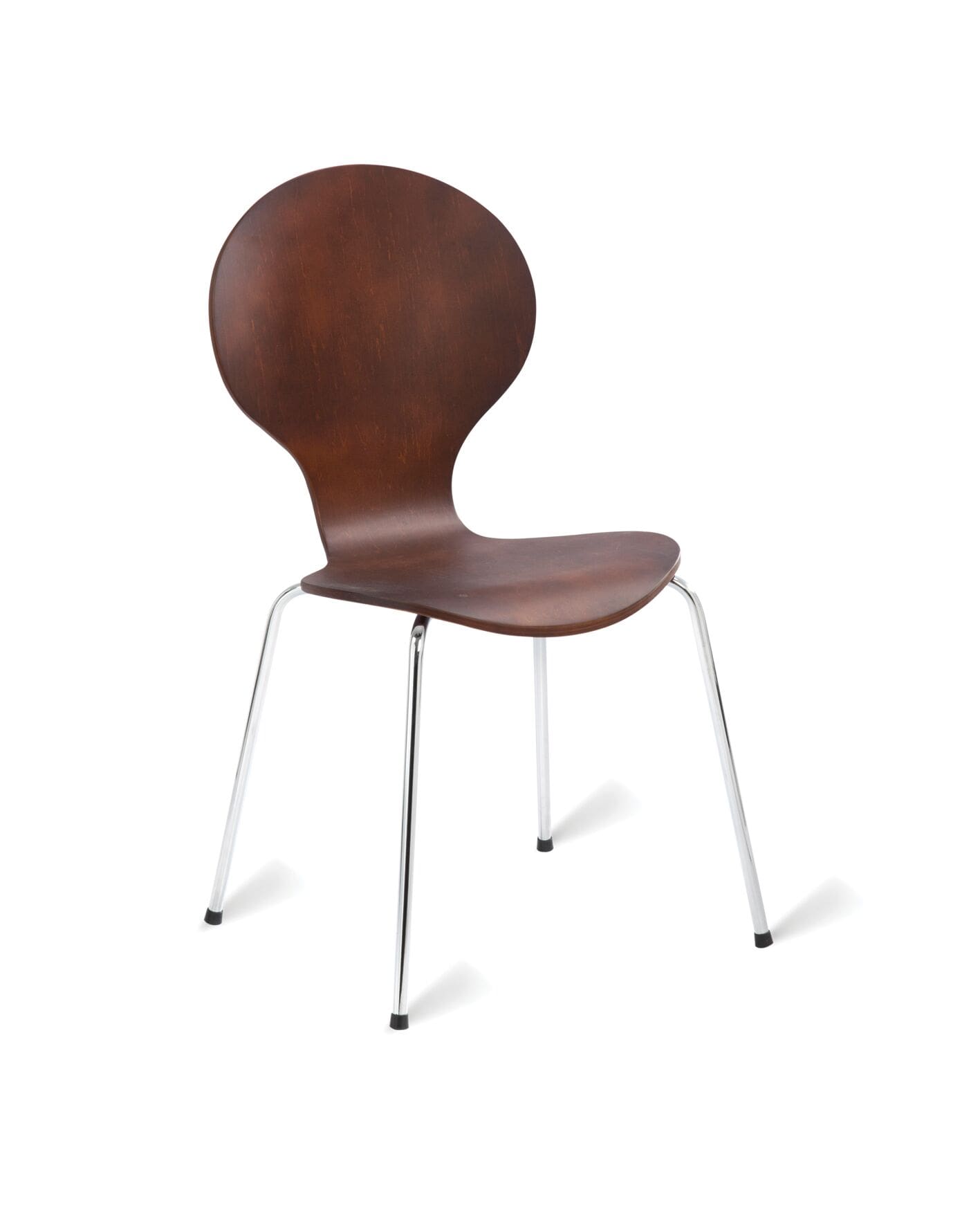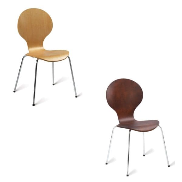 Side chair with maple veneer finish and chrome frame. Stack up to 6 high
