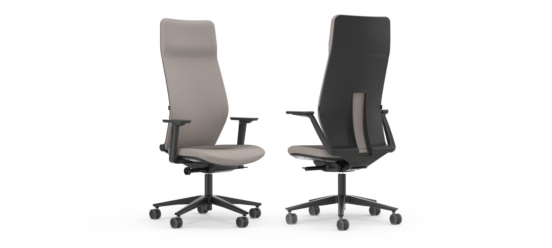 Executive upholstered chairs are available in black. Choose from distinctive fixed armrests or multifunction armrests and a black or polished five-star base with castors.
