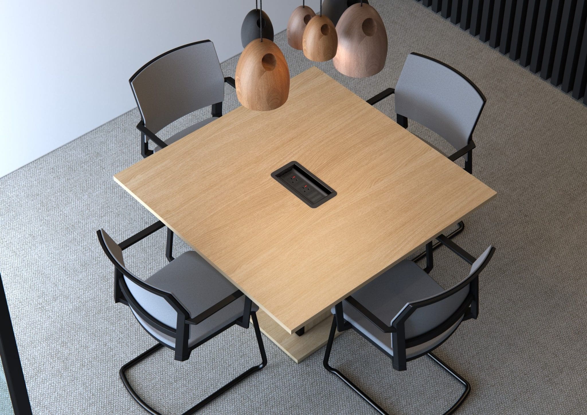 With its bold, strong presence ideally suited as a distinguished meeting table, Qube still delivers an element of sophistication in the workplace. With no bothersome table legs at the corners and a variety of table top sizes, Qube creates proximity and enhances communication between users. The unique base is robust and hollow, capable of housing multiple cables for installing power modules within the table top.