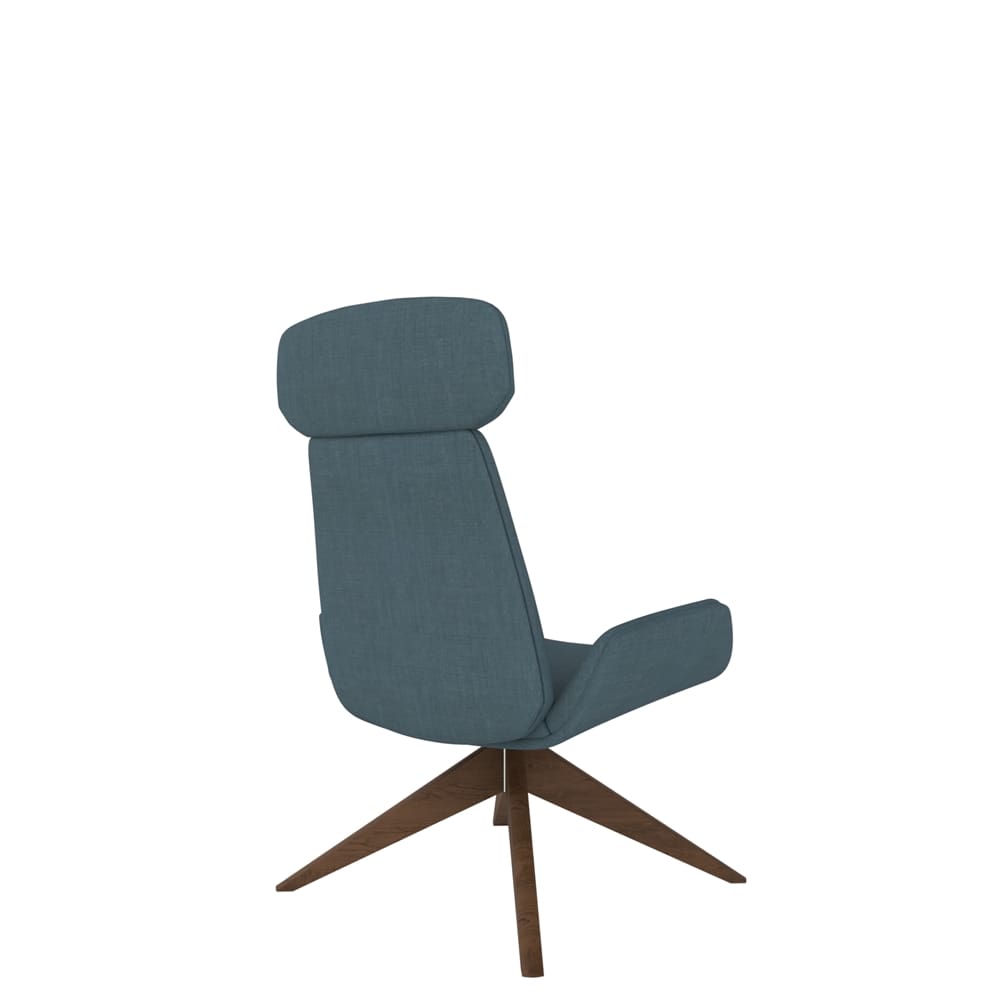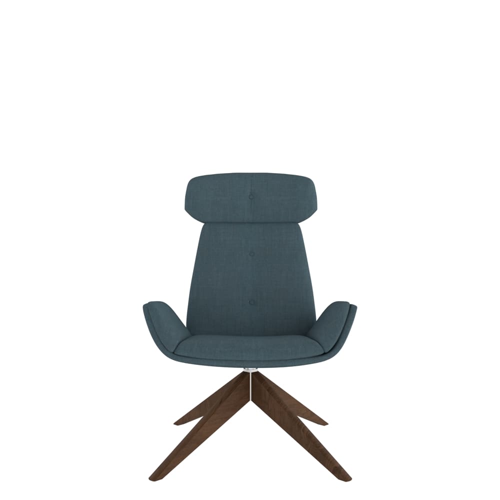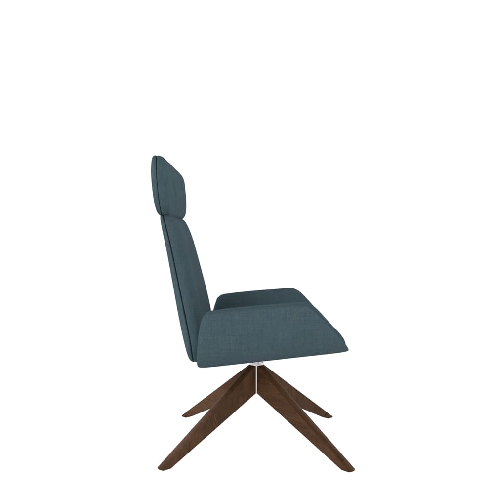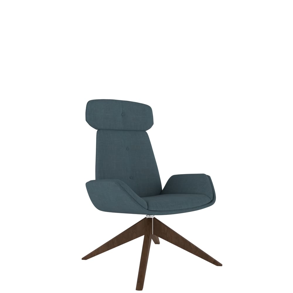 UPHOLSTERED LOUNGE ARM CHAIR WITH HEADREST AND WALNUT PYRAMID BASE