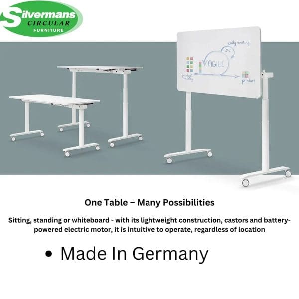 Sitting, standing or whiteboard – with its lightweight construction, castors and battery-powered electric motor, it is intuitive to operate, regardless of location