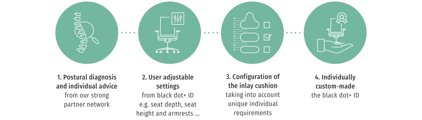 The perfect office chair must be individually adaptable in order to meet the personal requirements of the user. As an example – when choosing a mattress or even a simple shoe insole, there will always be personal considerations to take into account. Well-being and comfort, as well as an improvement of postural problems or medical conditions, will be the key considerations. In addition to the basic functions of an ergonomic office chair, black dot + ID can specifically address these requirements using its unique inlay cushions.